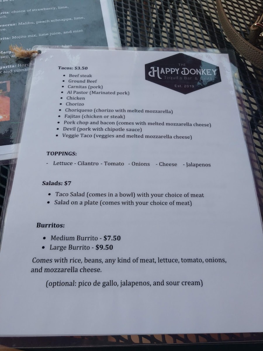 At Happy Donkey Mexican Grill, the menu offers a flavorful journey through classic Mexican dishes with a twist, all served with generous portions and a vibrant atmosphere. One standout option is the Happy Fajitas. Known for their sizzling presentation, these fajitas come with your choice of grilled meat, vegetables, and soft tortillas, offering a full range of flavors for $14.99. For those craving a hearty meal, the Happy Burrito is a must-try, filled with a delicious combination of rice, beans, choice of meat, and fresh toppings, all wrapped in a large flour tortilla, priced at $10.99. The Carne Asada Quesadillas also shine on the menu. These cheesy, crispy quesadillas are stuffed with tender carne asada and served with a side of salsa and guacamole for just $11.99. For a more traditional bite, the Tacos are available in a variety of fillings like grilled chicken, beef, or pork, each priced at $3.25 per taco. Whether you’re looking for something to share with friends or a filling solo meal, Happy Donkey Mexican Grill offers a diverse and satisfying menu that perfectly captures the essence of Mexican comfort food at reasonable prices.